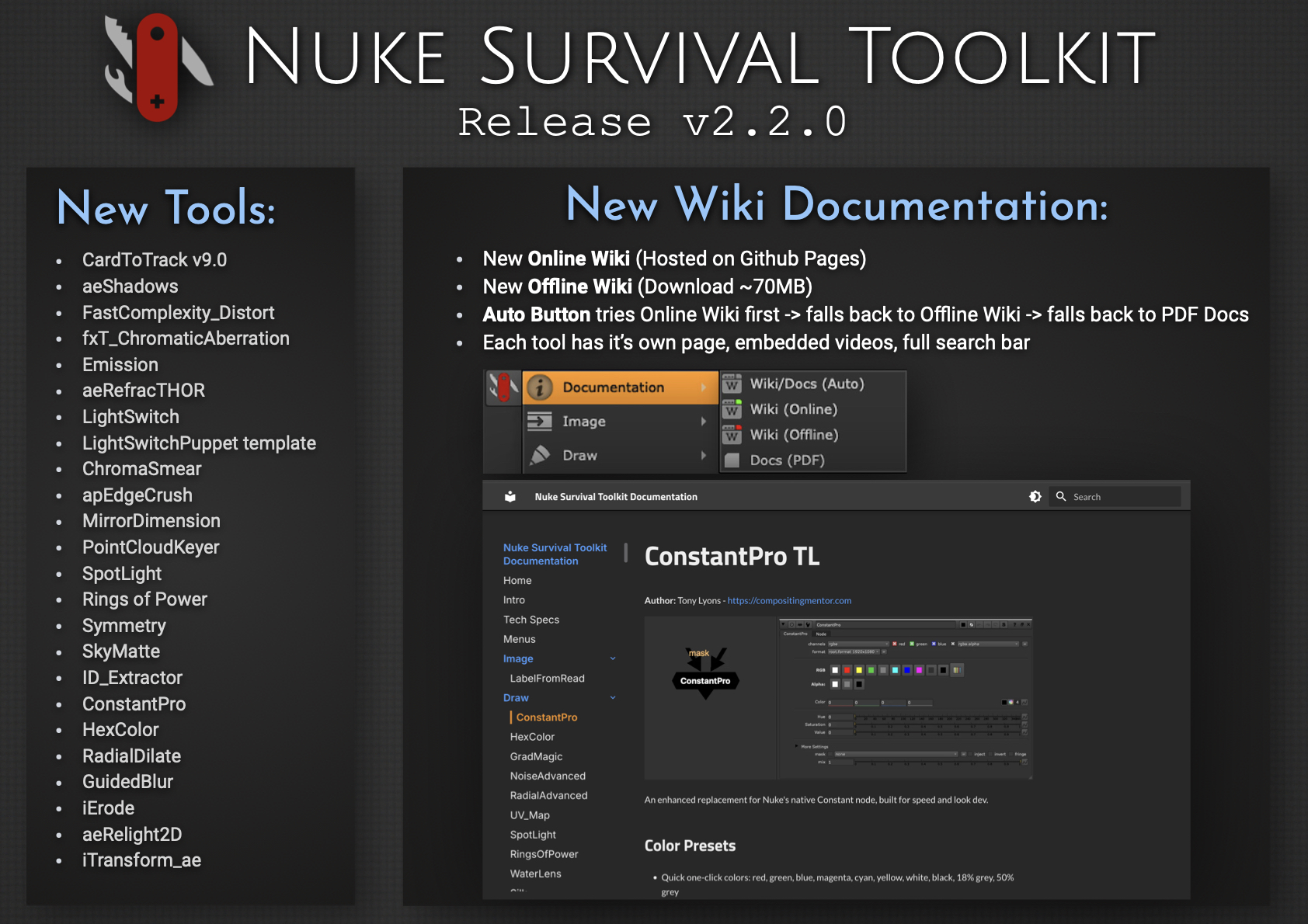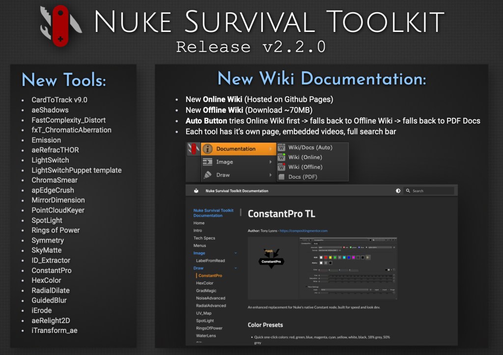 I’m excited to release Nuke Survival Toolkit v2.2.0, now featuring a brand-new Online Wiki, replacing the previous Google Docs setup. Each tool now has its own dedicated page with embedded videos and images, along with a fully functional search bar.