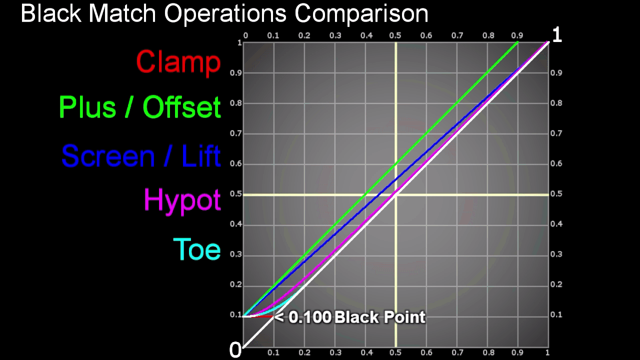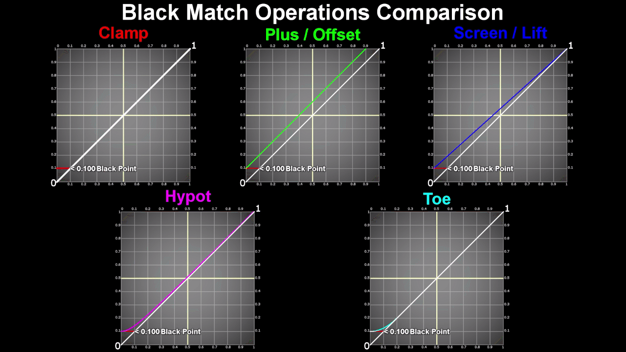Here’s some graphs comparing the most common operations of how to match the blackpoint and what they are doing to a 0-1 curve.